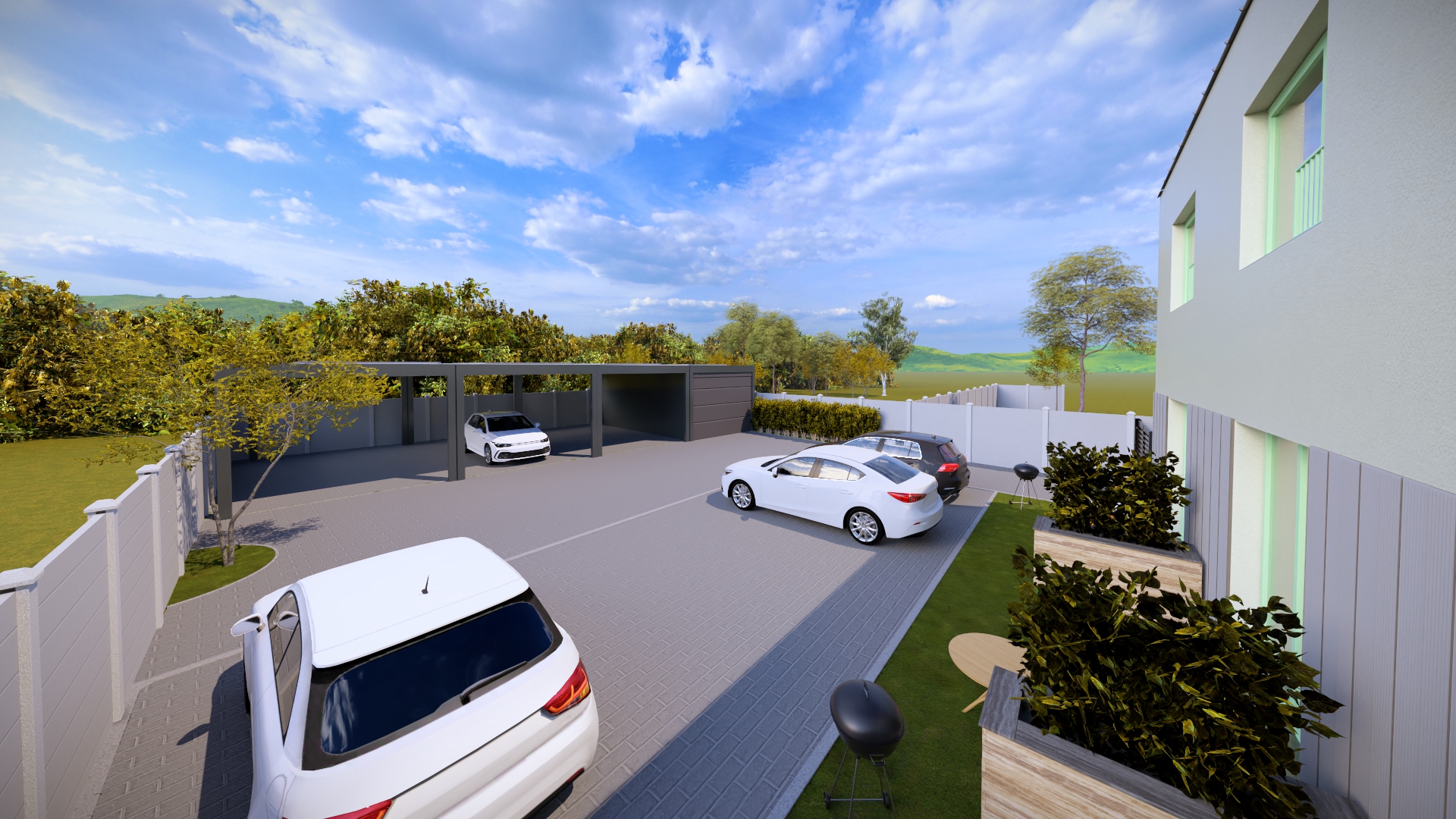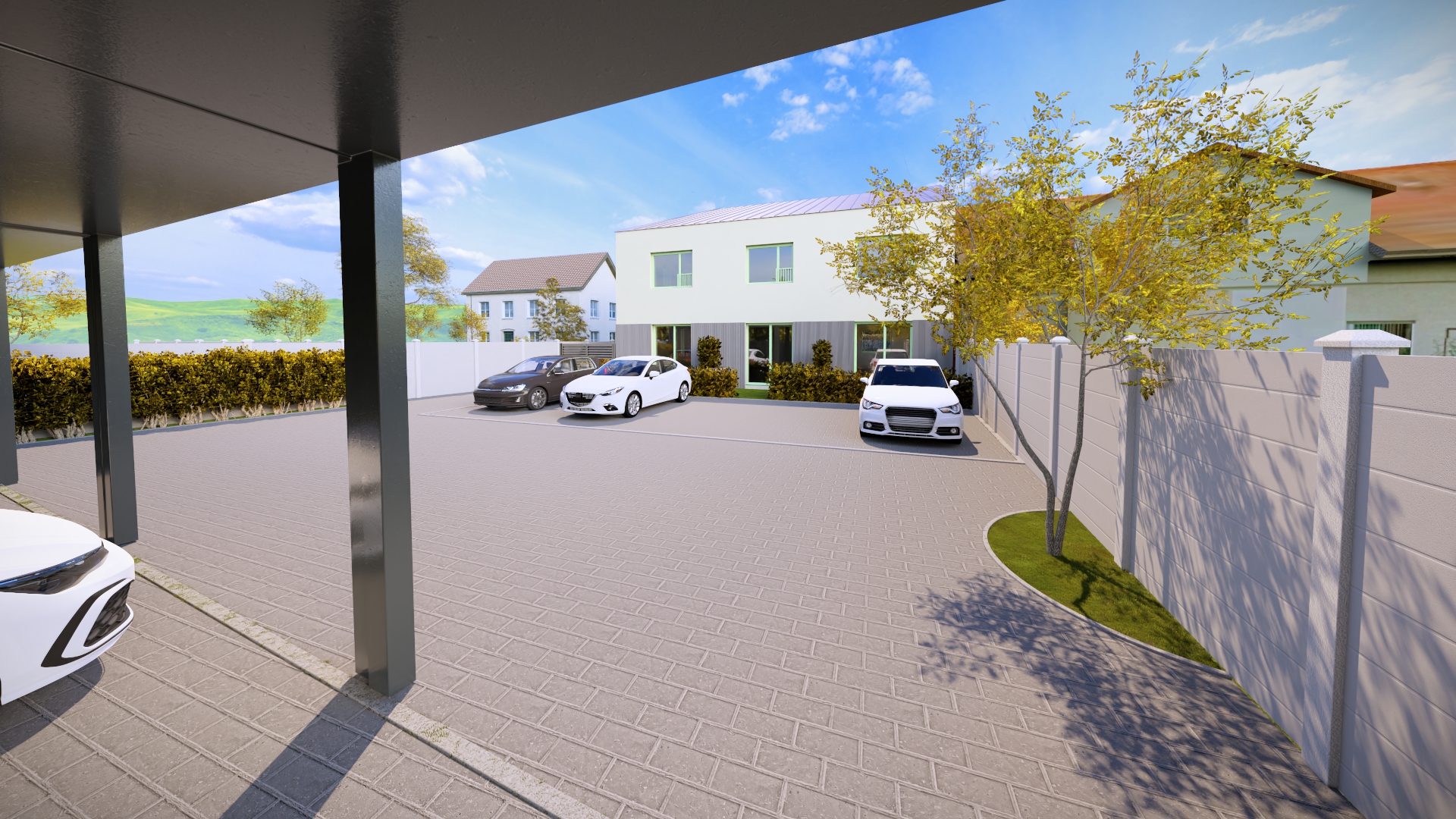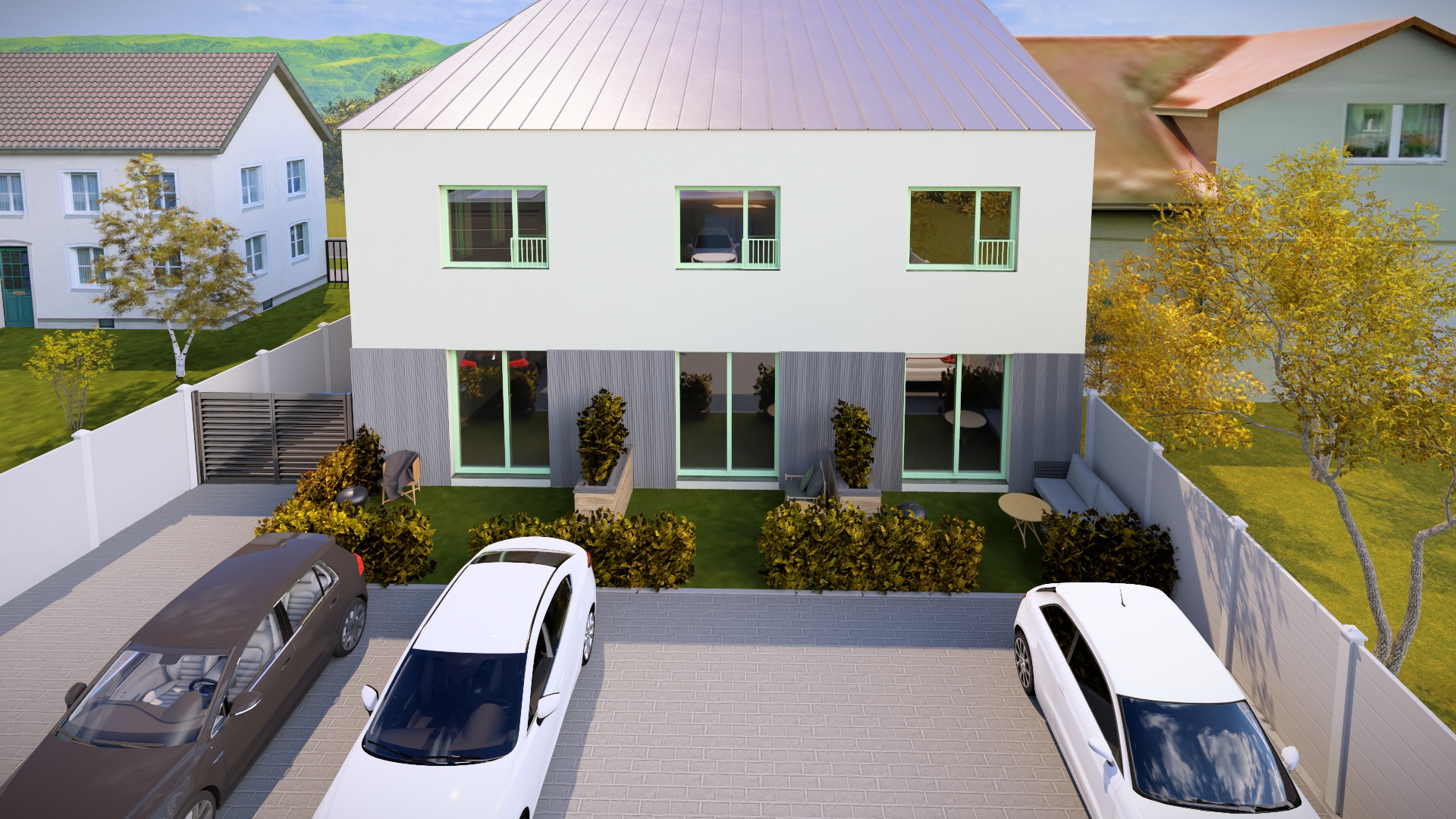 Dům bude mít fotovoltaiku a tepelné čerpadlo (vytápění/chlazení) i elektro nabíječku, byt podlahové vytápění a rekuperaci – nízké měsíční náklady a vysoký komfort.