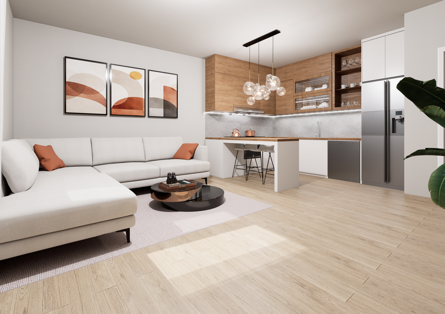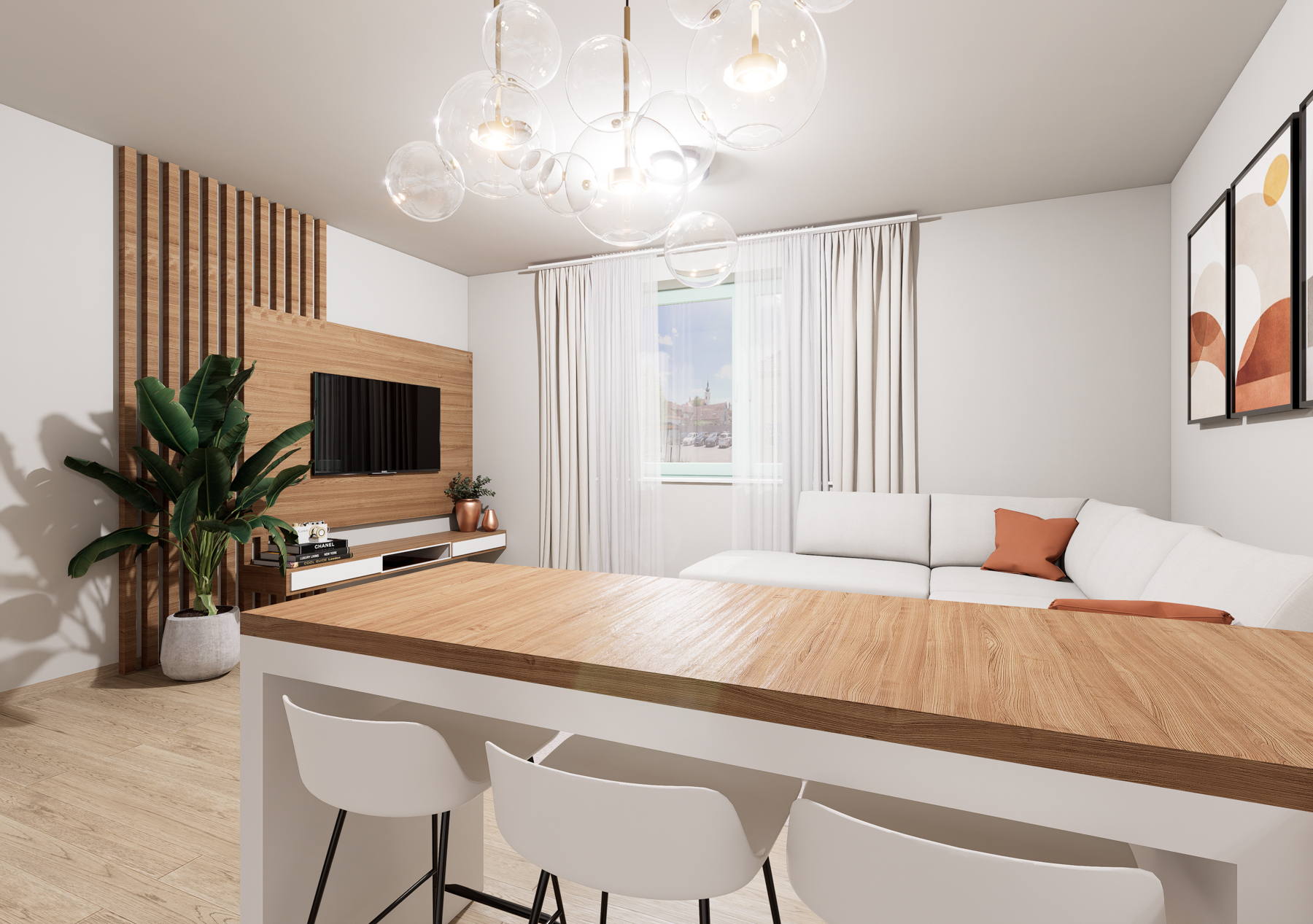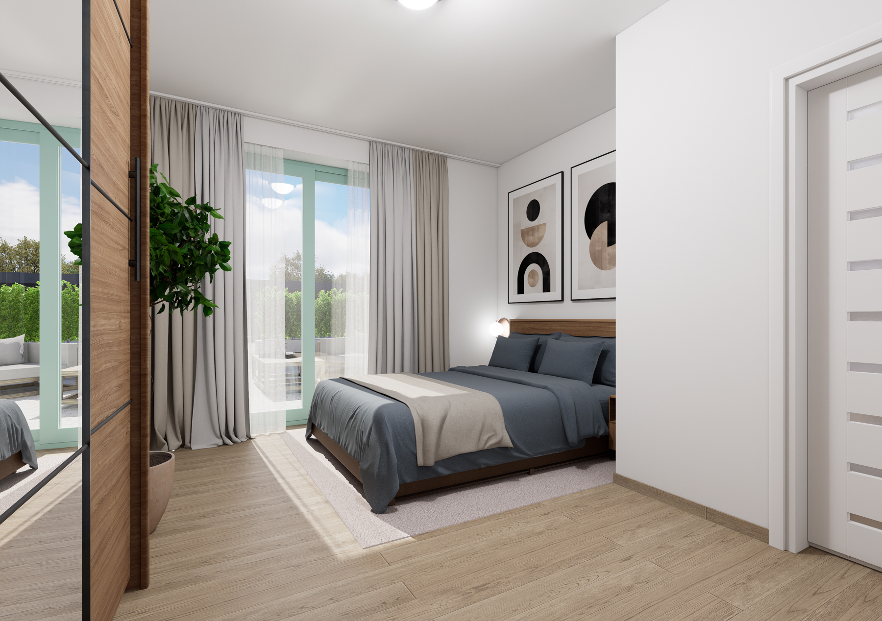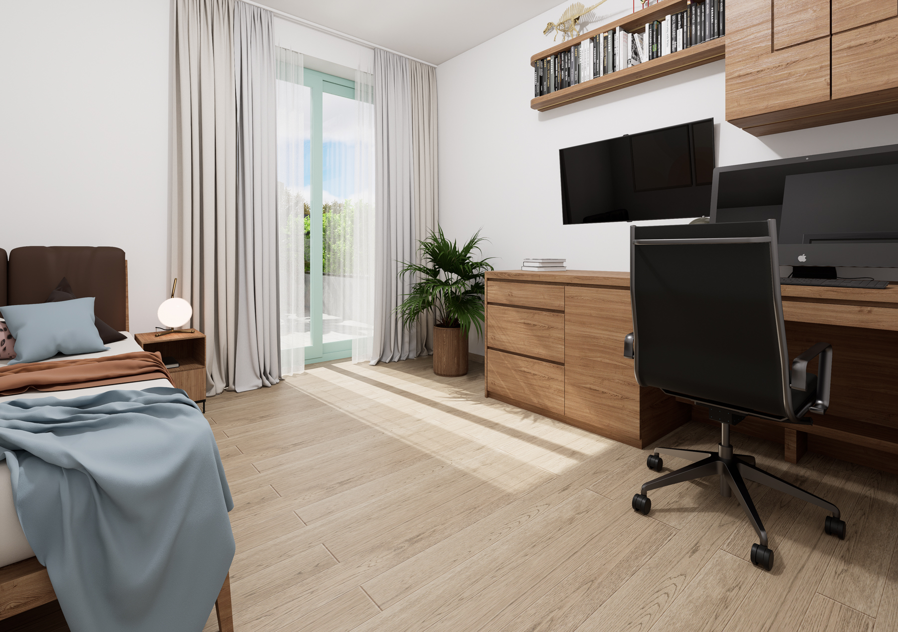 Dům bude mít fotovoltaiku a tepelné čerpadlo (vytápění/chlazení) i elektro nabíječku, byt podlahové vytápění a rekuperaci – nízké měsíční náklady a vysoký komfort.